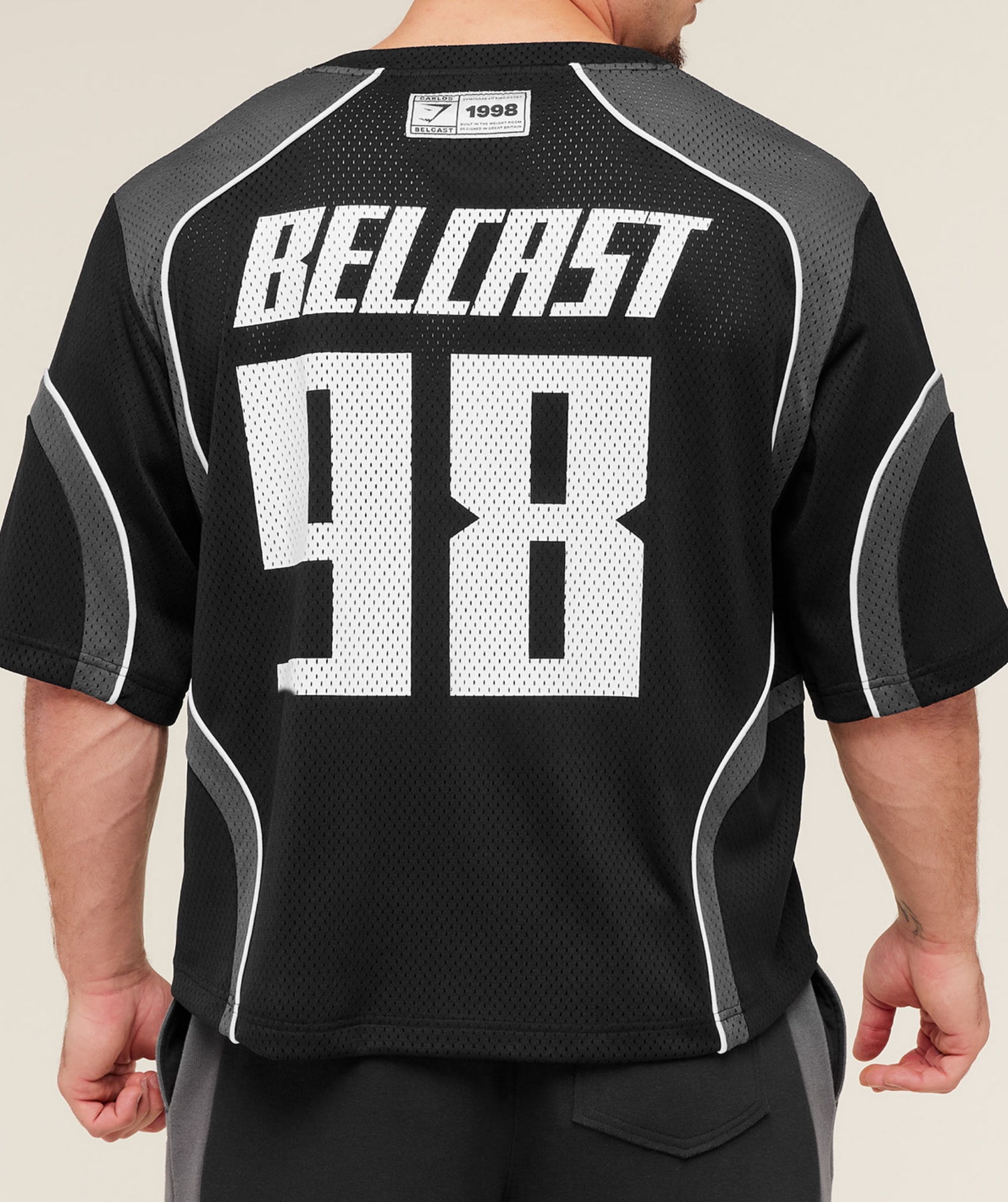Designed for a bold, defiant aesthetic with an extreme oversized fit, featuring contrast fabric stripes and an exclusive Carlos Belcast graphic.